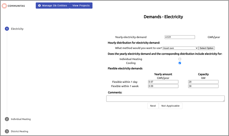 The user interface of the ECPT allows the end user to provide inputs to the tool in terms of energy demand regarding the baseline scenario of the energy community and of scenarios to be simulated for optimization purposes. The input values to be provided are: