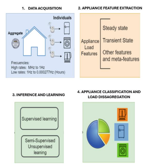 In the following figure, the pipeline of this tool can be observed. Data acquisition is achieved through meters installed in households, which provide electrical consumption magnitudes. These values are processed to generate new variables that allow for a deeper understanding of consumption. Subsequently, the models are capable of learning from historical data and making inferences about the new data, proceeding with the disaggregation of household devices.