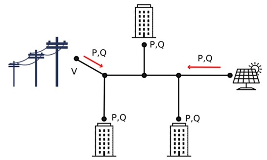 As illustrated in the following figure, the states include the voltages (both magnitudes and angles) at all buses and the currents at all lines. The measurements consist of power flows on the lines (red arrows), power consumption at consumer buses, and the voltage at the slack bus.