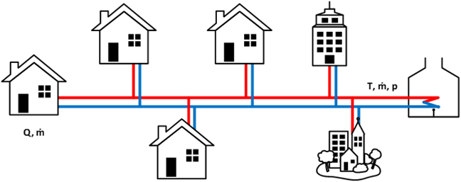 The goal of state estimation in the context of a District Heating Network, is to calculate all the states of a given network from a set of noisy measurements. As illustrated in next figure, the states include temperatures and pressure at nodes along with mass flow at all pipes. The measurements consist of the temperatures at selected nodes, the pressures at selected nodes, heat consumption and generation at end nodes as well as ambient temperature.
